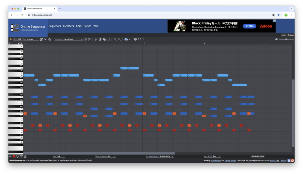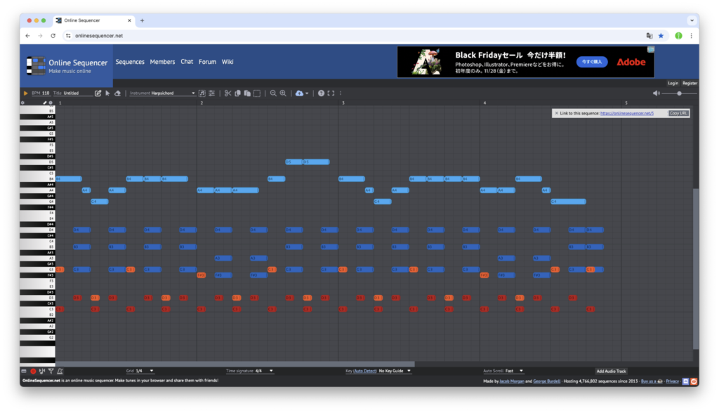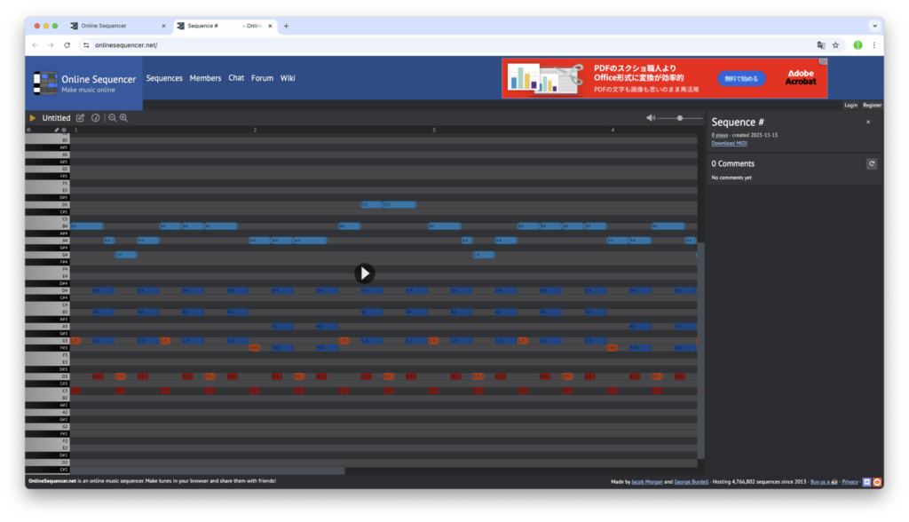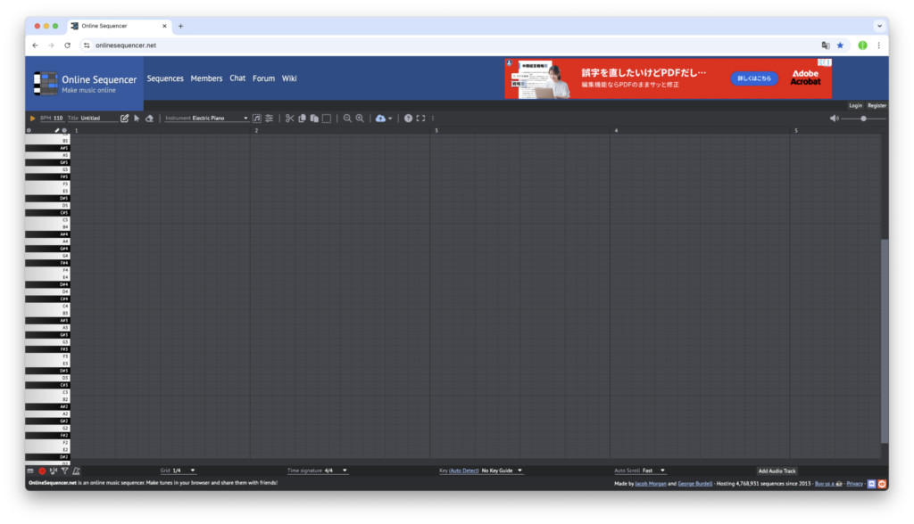 - 「https://onlinesequencer.net」にアクセスすると、アカウント登録やログインなどは不要で、このようなウィンドウが表示されます。