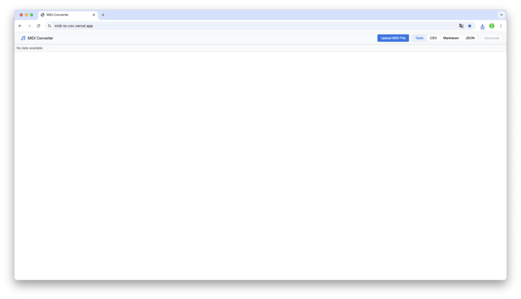 - 「https://midi-to-csv.vercel.app/」にアクセスすると、このようなウィンドウが表示されます。