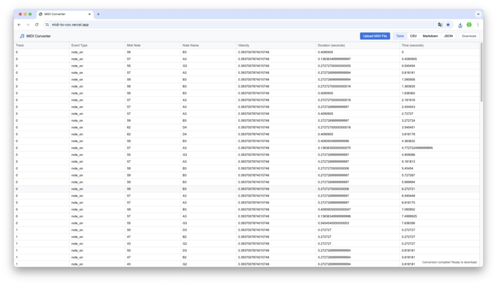 次にMIDIファイルをCSVファイルに変換します。こちらも「ChatGPT」に聞いたところ、「MIDI Converter」というWebアプリを紹介されました。