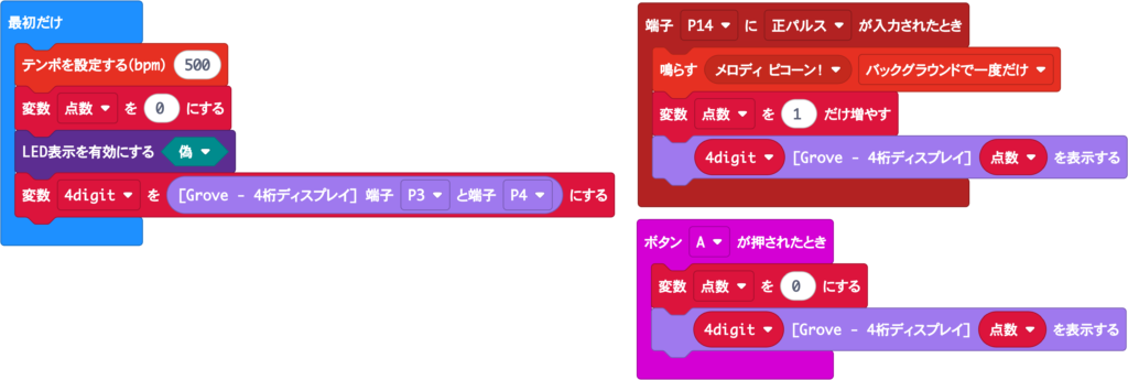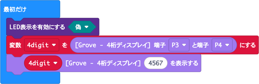 「Grove」拡張機能を使います。中にある「変数 4digit を[Grove – 4桁ディスプレイ] 端子 P3 と P4 にする」ブロックで7セグLEDモジュールの接続先を定義し、「4digit [Grove – 4桁ディスプレイ」XXXX を表示する」で数字を表示します。
