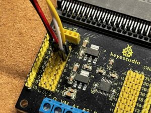 今回の「モータードライバー拡張ボード(KS4033)」を使う場合、電源として5Vを使う方がケーブルの接続先が同じところにまとまり、工作の出来がスッキリしそうです。
