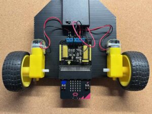 モータードライバ搭載のマイクロビット拡張ボード「KS4033」やギア付きモーターなどを組み合わせ、マイクロビットからの制御で走らせることができる車です。