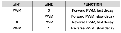 - xIN1=PWM, xIN2=1 → xOUT1=L, xOUT2=H と xOUT1=L, xOUT2=L が切り替わり