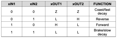 - xIN1=PWM, xIN2=0 → xOUT1=Z, xOUT2=Z と xOUT1=H, xOUT2=L が切り替わり