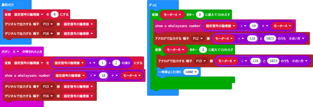 ボタンAを押すたびに、モータAのIN2(P13)、モータBのIN2(P16)がともに「0」と「1」に切り替わります。