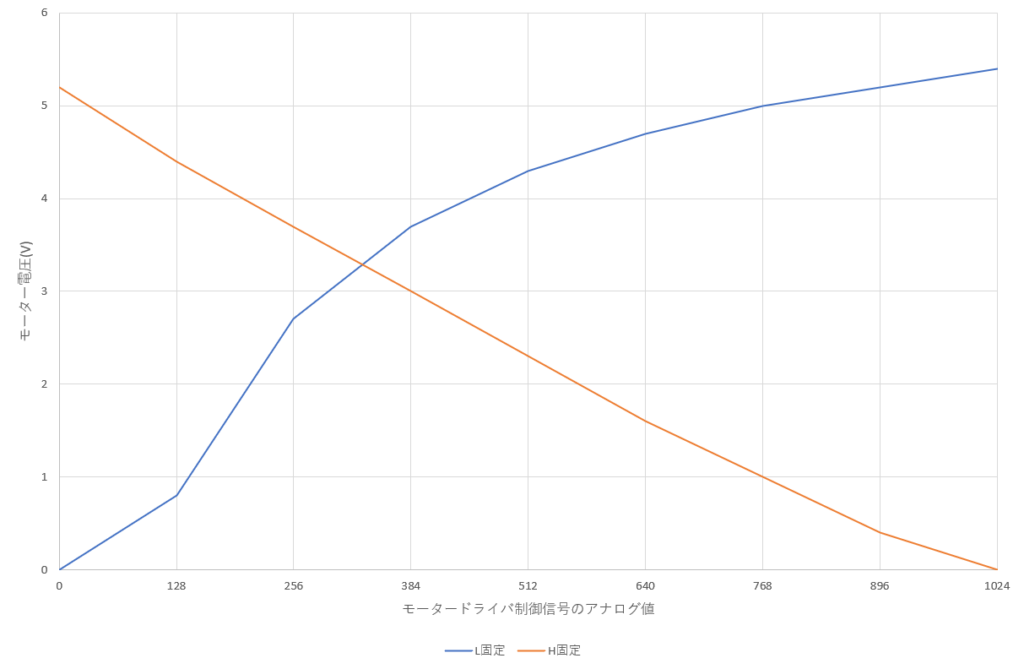 IN1のアナログ値を変動させたときのモーター電圧は以下のようになりました。