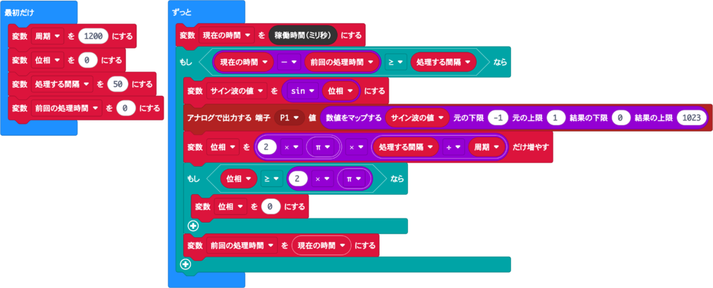 「sin」ブロックの入力は「位相」変数で設定します。「位相」変数の値は、1回の処理ごとに「2π x 処理する間隔 / 周期」だけ増やします。つまり「処理回数 x 処理する間隔 」が「周期」と同じになったとき「位相」は「2π」になり、サイン波がひとまわりします。「位相」が「2π」以上になったら「0」に戻しておきます。