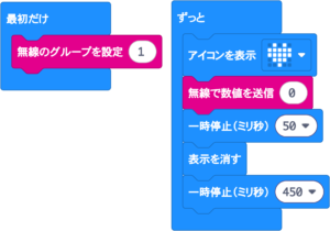 0.5秒ごとに無線で数値を送信しているだけです。送信する数値自体に意味はないので、毎回「0」を送信しています。送信したことが分かるように、送信時にアイコンを点灯させています。
