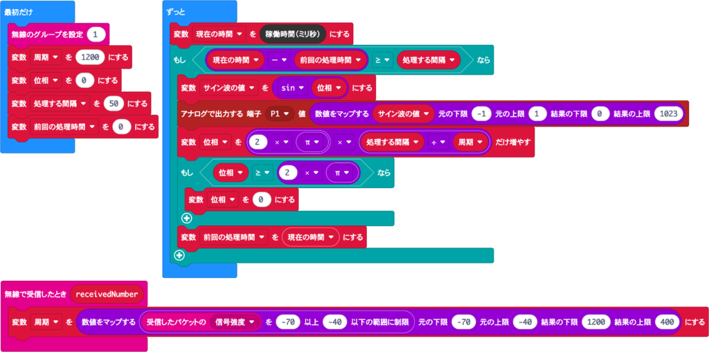 これで、マイクロビットが近づくと「周期」が短くなり、それによりLEDの明滅がはやくなることになります。