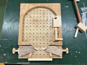 今回のピンボールゲームでも、ピンボール台に部分の製作については「木工班」に企画や指導をお願いしました。