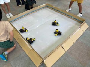 コースをつくってそこで遊んでもらったのですが、ハードウェアをつくるための部品は全員同じ、ソフトウェアも基本形は同じで工夫できる点は多くなかったにも関わらず、それぞれのロボカーの動きは結構バラエティにとんでおり、少しビックリしました。
