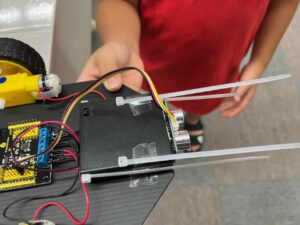 第1期でつくってもらったのは「マイクロビットロボカー」です。超音波センサで壁を検知し、お掃除ロボットのように壁にぶつからずに自動走行します。